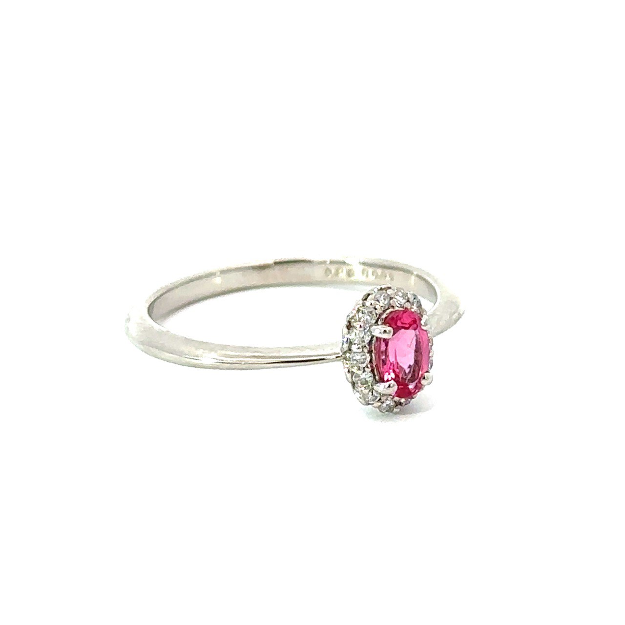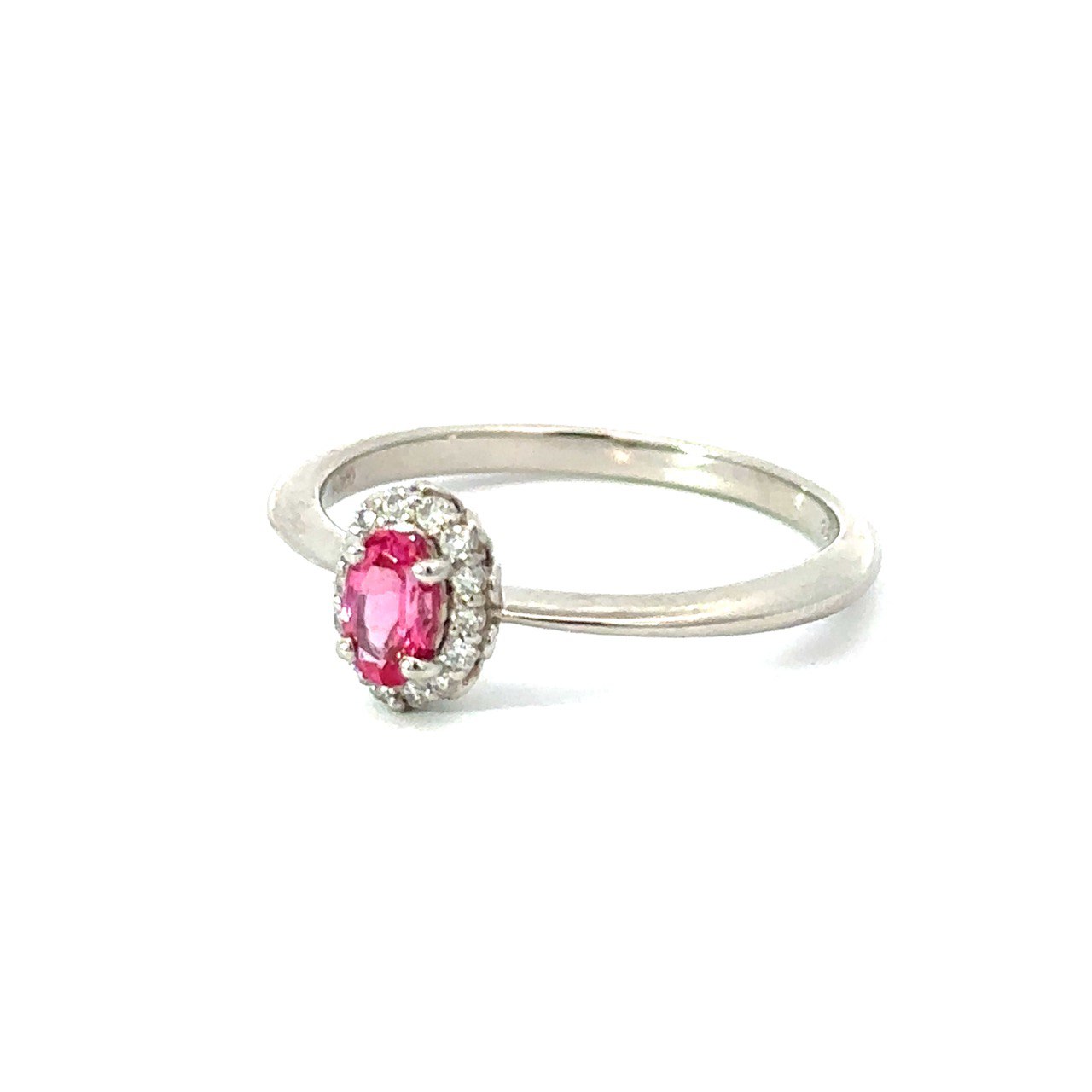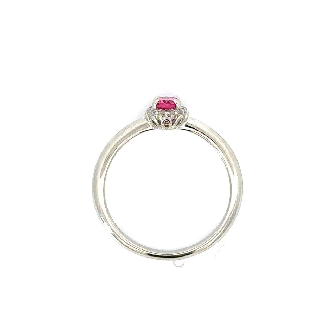 センターには0.20ct前後のピンクスピネルを配置し、周囲を繊細なメレダイヤがぐるりと取り巻くデザインです。ピンクスピネルの凛とした輝きと、ダイヤモンドの上品なきらめきが調和し、指元にやさしい華やかさを添えてくれます。
